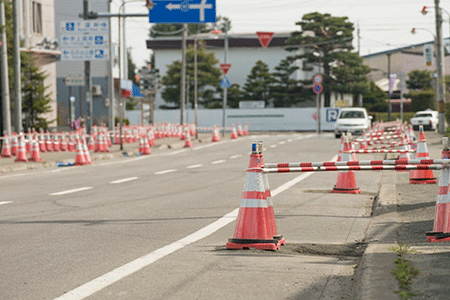 舗装切断をするのは専門業者に依頼し、当社では、その作業の合番、路面清掃、作業帯の設置・撤去などを行います。